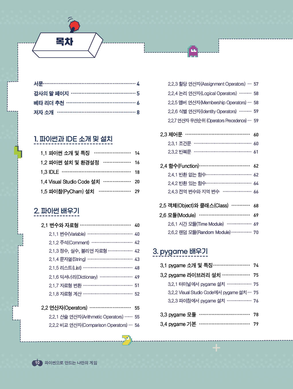 이 책은 Pygame 라이브러리를 이용하여 간단하게 도형을 만드는 것부터 시작하여 하나의 게임을 만드는 프로세스를 친절하게 설명하고 있다. 이해를 위한 예시와 팁은 게임을 처음 만들어 보는 사람들에게 게임에 대한 직관을 가져다준다. 더 나아가 무료 리소스 활용과 실행 파일을 만드는 방법, 게임을 조금 더 업그레이드시킬 수 있는 아이디어도 제시해준다. 이 책을 통하여 파이썬을 익히고, 게임 개발에 대한 꿈을 펼칠 수 있는 좋은 발판이 될 것이다.