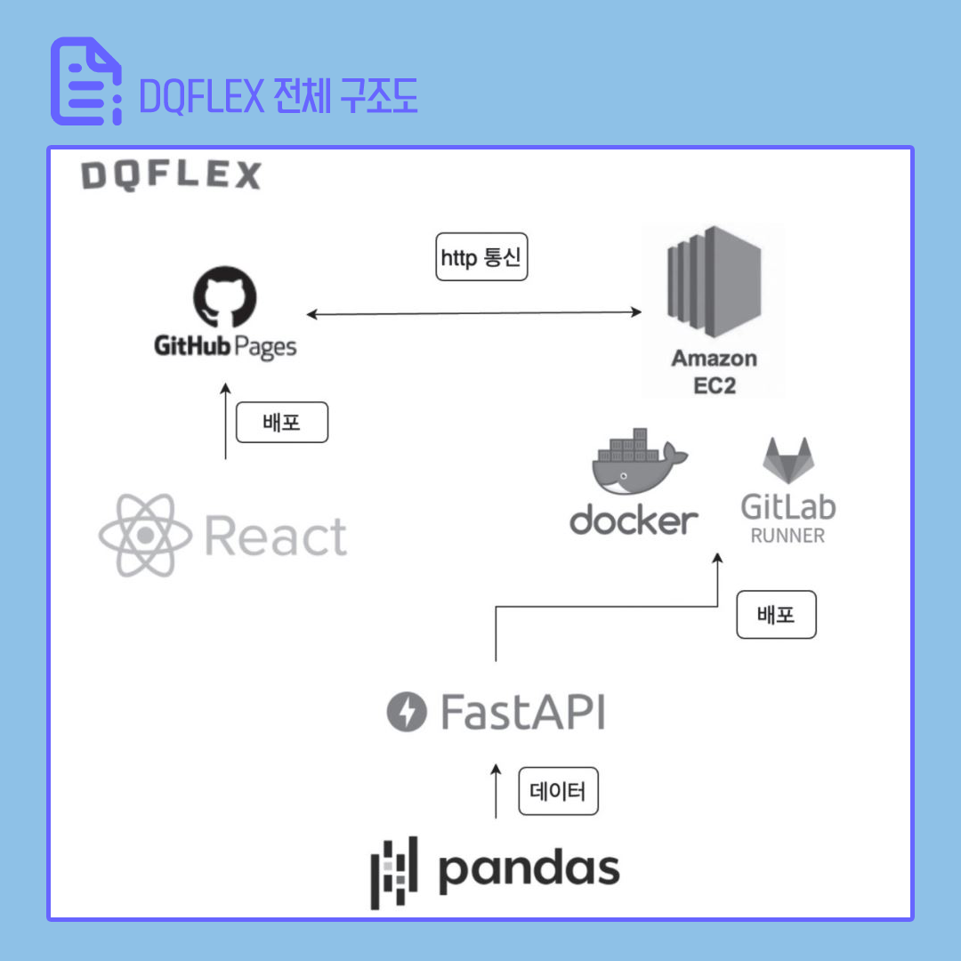 다음으로 앞으로 완성할 프로젝트 DQFLEX의 핵심 화면을 소개해 보겠습니다. 화면을 보면서 필요한 데이터의 형태, API 종류 등을 미리 생각해 보세요!