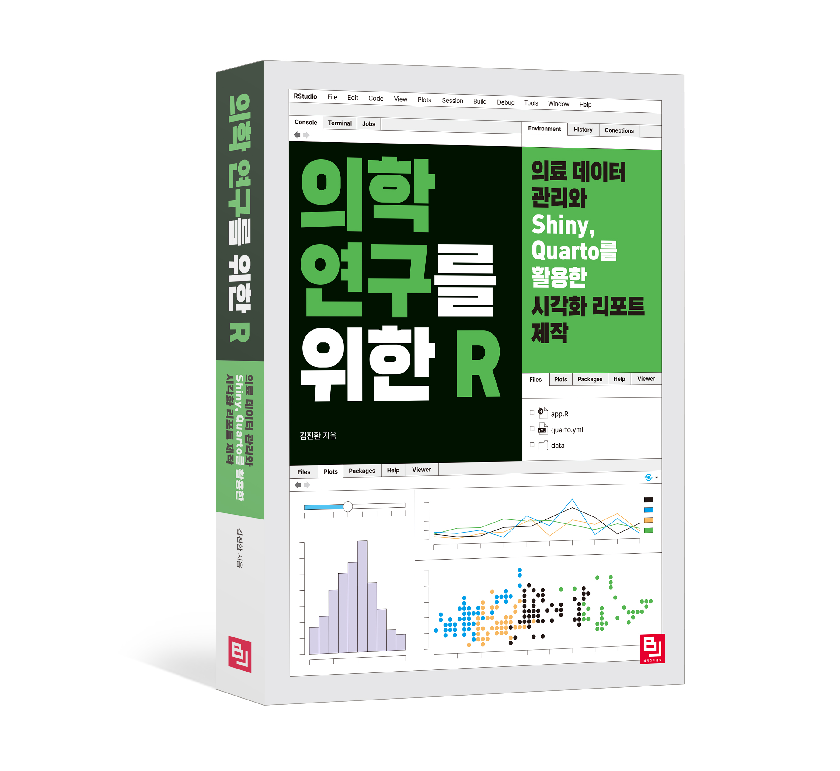이 책에서는 R을 사용한 의학 연구의 예시로 의학 연구와 R 사이의 관계를 정립하고, 곧바로 개인 PC 환경에서 어떻게 작업 환경을 구축하는지 알아봅니다. 그리고 연구 데이터를 다룰 때 필수적인 기본 통계와 데이터 기반 시각화를 R을 통해 학습한 후 분석과 통계에 유용한 R 패키지에 대해서도 하나씩 살펴봅니다. 또한, 특정 연구에 최적화된 패키지를 제작하는 방식과 이를 다른 필요한 연구자가 활용할 수 있도록 배포하는 과정을 거쳐봅니다. 마지막으로, 데이터 관리 및 프로그래밍에 직접 참여하지 않은 다른 연구자나 고객 또는 환자에게 보기 좋은 리포트를 공유할 수 있도록 돕는 Shiny와 Quarto에 대해 상세하게 학습해봅니다.